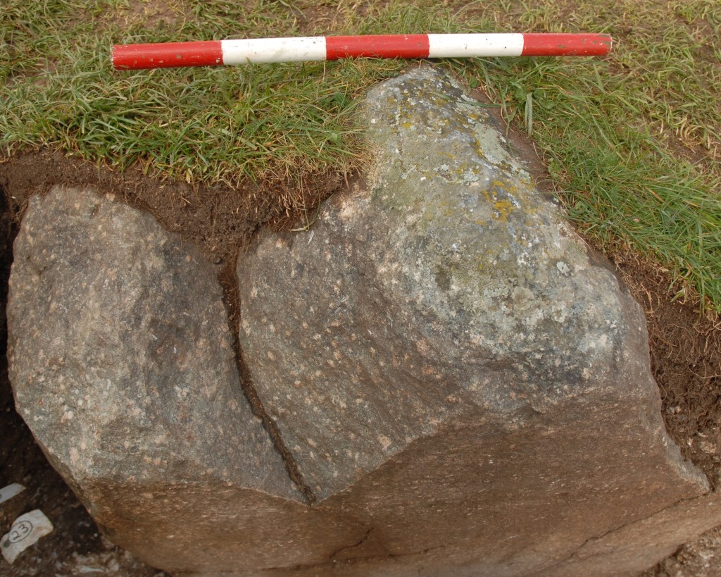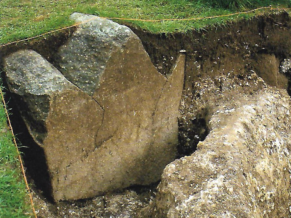 In 2008, during excavations conducted by T. Darvill and G. Wainwright [12], stump 35a, buried in its original position, was uncovered (Fig. 14, 15). Its upper part, 35b, lies partly buried in the ground a few metres further away by the peripheral upright 10 (Fig. 2, 16). The related article [12] states that the damage to the stump is typical of medieval stone theft. Similarly considered in [15]. However, from the shape of the fracture surface of stump 35a, the two vertical fissures, and the positions of the fragments of the pillar, it is evident that it was fractured by a sudden, single impact of a very heavy object from the direction of the trilithons of SH 53, 54 and 154. Such destruction, resulting in two fragments distant from each other, could not have been caused by hand tools, such as a stone hammer.
