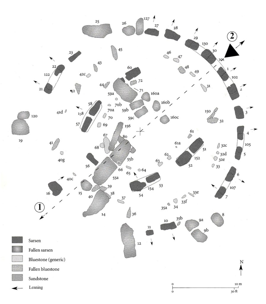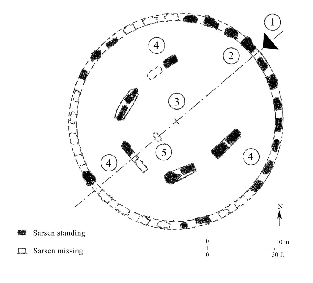 - Two groups of massive uprights connected by lintels, called the Sarsen Circle (SC) and Sarsen Horseshoe (SH).