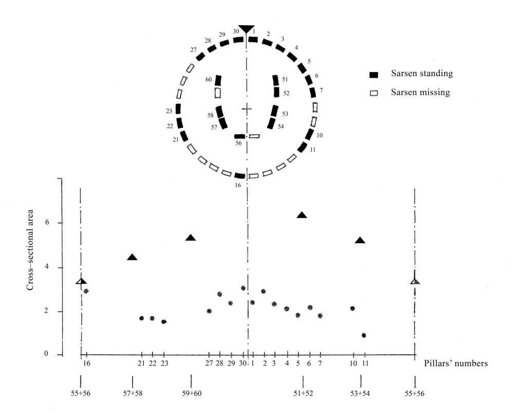 The bearing capacity was greatest at the main northeast entrance and decreased progressively, with the uprights becoming clearly slimmer as the the distance from the entrance increased (Fig. 7). This pattern corresponded to a gradual reduction in the distance between the SC and the trilithons, i.e. between the supports of a possible timber-framed roof. Such a reduction would have decreased the load on the supporting uprights, further suggesting the existence of a roof.